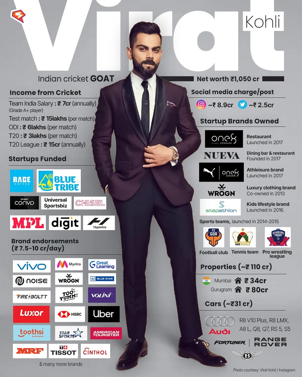ஆயினும், அவரைக் காட்டிலும் கோஹ்லியின் சொத்து மதிப்பு பத்துக் கோடி ரூபாய் சொத்து அதிகம். அதாவது, கோஹ்லிக்கு ரூ.1,050 கோடி மதிப்பிலான சொத்து இருப்பதாகக் கூறுகிறது அவ்வறிக்கை.