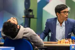 தோல்வி அடைந்துவிட்டோம் என்று தெரியவந்ததும் கார்ல்சன் விரக்தியில் சதுரங்கக் காய்களைப் பலகையிலிருந்து தட்டிவிட்டார்.