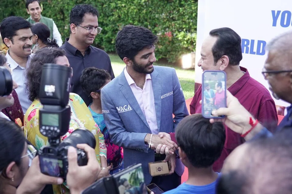 சனிக்கிழமை (டிசம்பர் 14) மாலை குகேஷைச் சிறப்பிக்க இந்தியத் தூதரகத்தில் ஏற்பாடாகியிருந்த நிகழ்வில் குகேஷின் தந்தை, தாயார் டாக்டர் பத்மா குமாரி, பாட்டி புனிதவதி உள்ளிட்ட உறவினர்கள் வந்திருந்தனர். அந்நிகழ்ச்சிக்கு வருகை தந்திருந்த இந்தியச் சமூகத் தலைவர்கள், ஆர்வலர்கள் உள்ளிட்ட ஏறத்தாழ 70 பேர் குகேஷின் வெற்றியைக் கொண்டாடினர்.