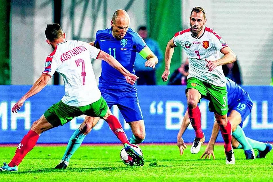 பல்கேரியாவின் ஜோர்ஜி கொஸ்டடினோவை (இடக்கோடி) கடந்து பந்தைக் கொண்டு செல்ல முயல்கிறார் நெதர்லாந்து குழுவின் கேப்டன் ஆர்யன் ரோபன் (இடமிருந்து 2வது). படம்: ஏஎஃப்பி