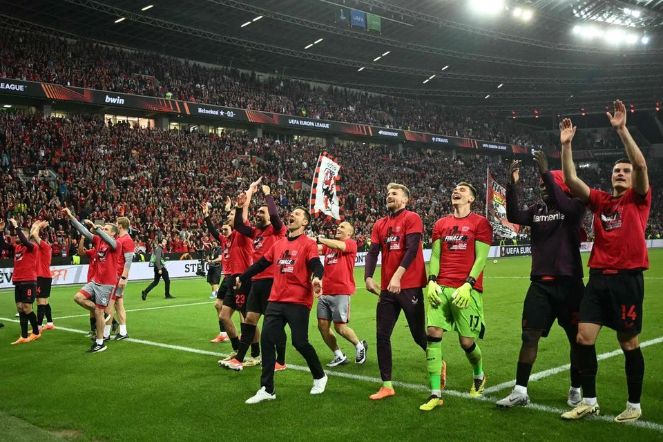 யூரோப்பா லீக் போட்டியின் இறுதியாட்டத்துக்கு முன்னேறிய பிறகு கொண்டாடும் பயர் லெவர்க்குசன் வீரர்கள். - படம்: ஏஎஃப்பி