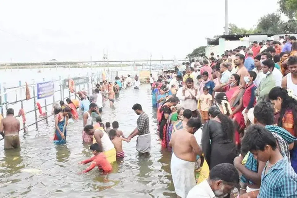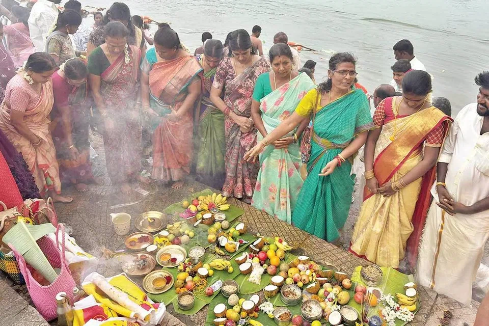 சேலம் மாவட்டம் மேட்டூரில் அணையின் மட்டம் பகுதியில் மக்கள் தலையில் அருகம்புல், நாணயம் வைத்து காவிரியில் மூழ்கி புனித நீராடினர்.
