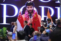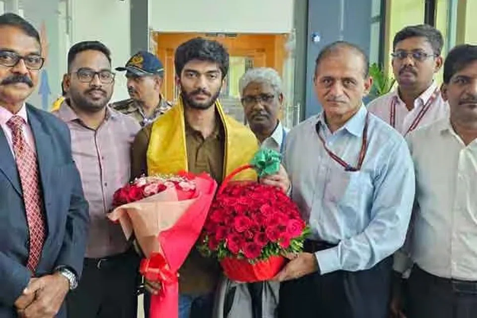 உலக சதுரங்க சாம்பியன் பட்டம் வென்ற தமிழக வீரர் குகேஷ் திங்கட்கிழமை சென்னை திரும்பியபோது பிரம்மாண்ட வரவேற்பு அளிக்கப்பட்டது.