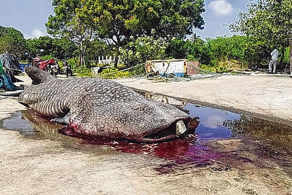புதுச்சேரியில் உள்ள தேங்காய்த்திட்டு மீன்பிடித் துறைமுக கடற்கரையோரமாக 15 மீட்டர் நீளம், 2.5 டன் எடை கொண்ட ராட்சத திமிங்கிலம் ஒன்று இறந்த நிலையில் கரை ஒதுங்கி இருந்தது. அதனை அப்பகுதி மீனவர்களும் பொதுமக்களும் ஆர்வமாகத் திரண்டு வந்து பார்த்துச் சென்றனர். திமிங்கிலச் சுறா அல்லது அம்மணி உளுவை என்பது உலகில் உள்ள மீன்கள் யாவற்றிலும் மிகப்பெரியவை ஆகும். தனித்து வாழும் இவ்வகை மீன்கள், நாள்தோறும் 2.6 டன் உணவை உட்கொள்ளும். இந்த திமிங்கிலம் கப்பல் போன்றவற்றில் அடிபட்டு இறந்த நிலையில் கரை ஒதுங்கி இருக்கலாம் என்று மீனவர்கள் தெரிவித்தனர். படம்: ஊடகம்
