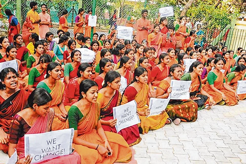 அந்தப் பேராசிரியர்கள் மீது உரிய நடவடிக்கை எடுக்க வலியுறுத்தி மாணவிகள் உள்ளிருப்புப் போராட்டத்தில் ஈடுபட்டனர். மாணவிகளுக்கு காங்கிரஸ், விடுதலைச் சிறுத்தைகள் உள்ளிட்ட அரசியல் கட்சிகள் மட்டுமல்லாமல் பல்வேறு அமைப்புகளும் ஆதரவு அளித்துள்ளன. மேலும், கல்லூரி நிலவரம் குறித்து முதல்வர் மு.க.ஸ்டாலினுக்கு மாணவிகள் கடிதம் ஒன்றும் எழுதியுள்ளனர்.