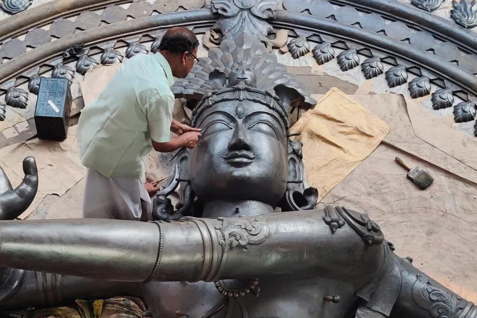 தமிழகத்தின் சுவாமி மலை பகுதியில் இந்தச் சிலை வடிவமைக்கப்பட்டது.