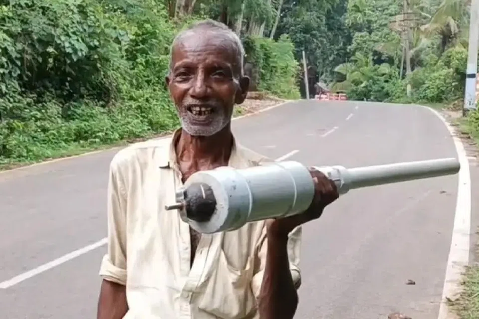 தற்போது நெகிழிக் குழாய் ஒன்றில் கற்கள், காகிதங்கள், வாசனைத் திரவியங்கள் ஆகியவற்றைப் பயன்படுத்தி அவர் உருவாக்கிய கருவி பார்ப்பதற்கு துப்பாக்கி போன்று உள்ளது.