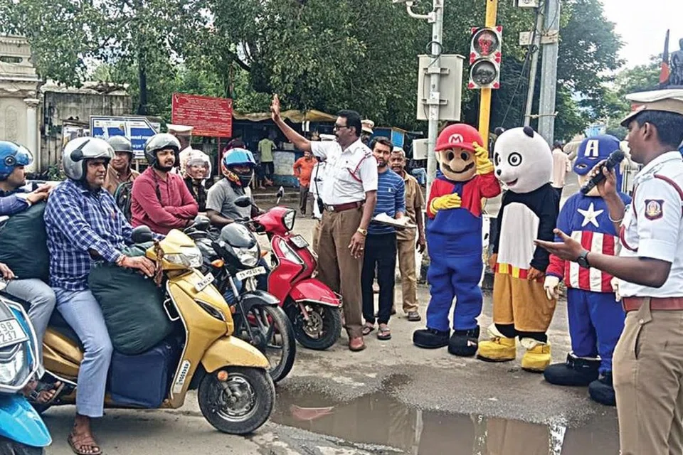 சென்னை வேப்பேரியில் உள்ள காவல் ஆணையர் அலுவலகம் அருகே போக்குவரத்துக் காவல் ஆய்வாளர் பாண்டிவேலு தலைமையில் போக்குவரத்துக் காவல்துறையினர் நேற்று தலைக்கவசம் குறித்த விழிப்புணர்வு நிகழ்ச்சிக்கு ஏற்பாடு செய்திருந்தனர். அப்போது கார்ட்டூன் பொம்மைபோல வேடமணிந்த கலைஞர்கள் மூலம் இருசக்கர வாகனமோட்டிகளுக்கு இனிப்பு வழங்கி போக்குவரத்து விதிமுறைகள் பற்றிய விழிப்புணர்வை ஏற்படுத்தினர்.