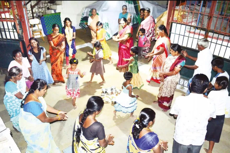 பின்னர் தாங்கள் கொண்டு வந்த உணவு பதார்த்தங்களை படைத்து வழிபட்டனர். அதைத்தொடர்ந்து பிள்ளையாரை பாவித்து, நிலாவை பூமிக்கு அழைக்கும் விதமாக பெண்கள் வட்டமாக நின்று தமிழர்களின் பாரம்பரிய முறைப்படி ஆடி, பாடி கும்மியடித்தனர்.
