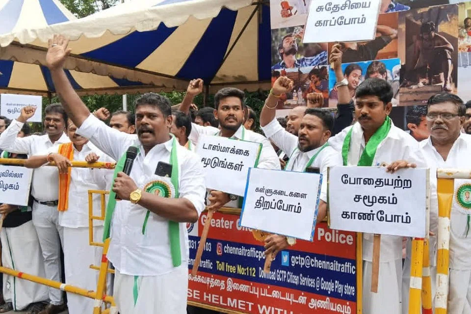 சென்னை: தமிழகத்தில் கள்ளச்சாராயத்தை அறவே ஒழிக்க வேண்டும். அதற்காக கள்ளுக்கடைகளை மீண்டும் திறக்க வேண்டும் என்று வலியுறுத்தி, சென்னையில் தமிழ் நாடு வியாபாரிகள் சங்கப் பேரவை சார்பில் செவ்வாய்க்கிழமை (9.7.24) போராட்டம் நடத்தப்பட்டது. அத்துடன் முழுமையான மதுவிலக்கை அமல்படுத்த வேண்டும் என்றும் அவர்கள் அரசுக்குக் கோரிக்கை விடுத்தனர்.