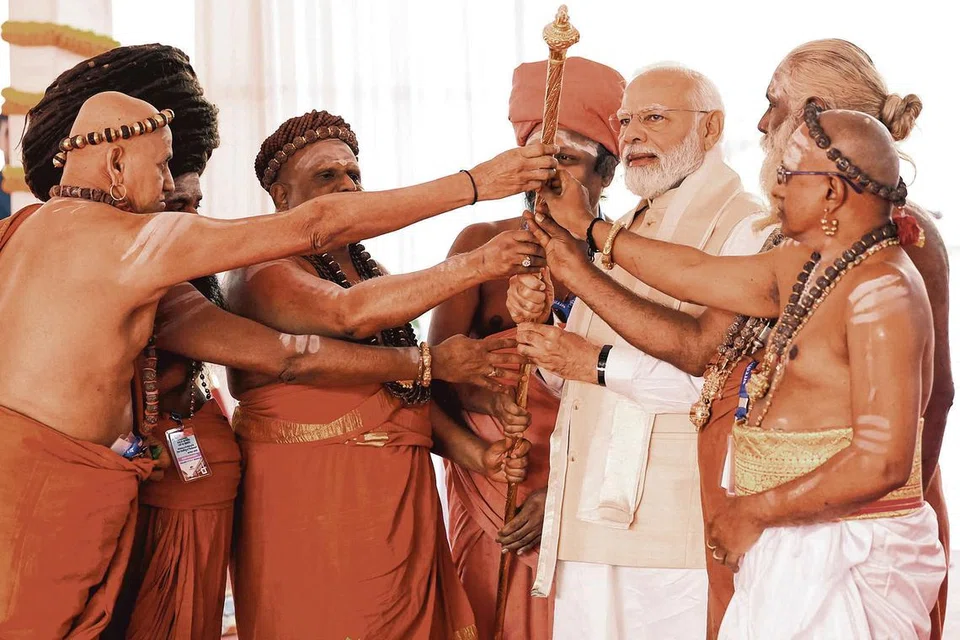 தமிழ் மறைகள் முழங்க, தமிழ்நாட்டைச் சேர்ந்த திருவாவடுதுறை, மதுரை உள்ளிட்ட 20 ஆதீனத் தலைவர்கள் செங்கோலைப் பிரதமரிடம் வழங்கினர். அவர்களிடம் ஆசி பெற்றுக்கொண்ட திரு மோடி செங்கோலை மக்களவைத் தலைவரின் இருக்கைக்கு அருகே நிறுவினார்.
