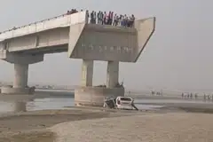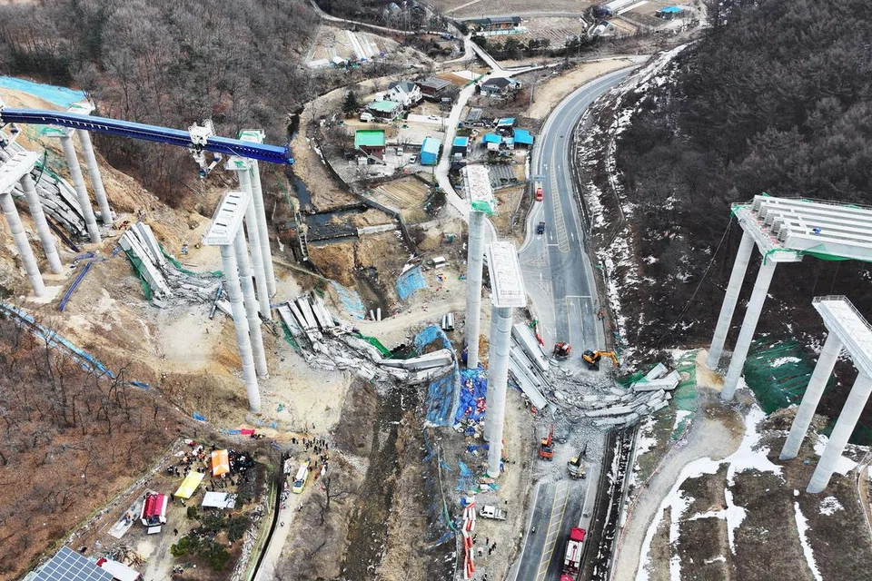 நெடுஞ்சாலைப் பாலத்தைத் தாங்கிப் பிடித்திருந்த, 50 மீட்டர் உயரம் கொண்ட ஐந்து கான்கிரீட் தூண்கள் ஒன்றன்பின் ஒன்றாகச் சரிந்து விழுந்ததாக யோன்ஹப் செய்தி நிறுவனம் தெரிவித்துள்ளது.