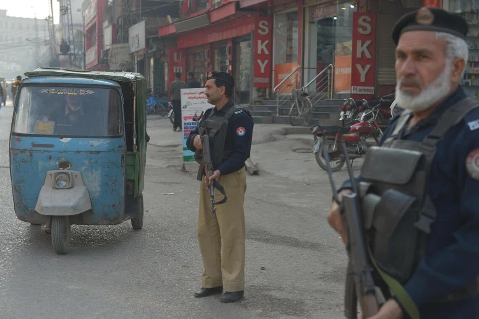 பெஷாவர் மாநிலத்தில் பாகிஸ்தானிய காவல்துறை அதிகாரிகள் பணியில் உள்ளனர். கடந்த நவம்பர் மாதம் 25ஆம் தேதி எடுக்கப்பட்ட படம். - படம்: இபிஏ