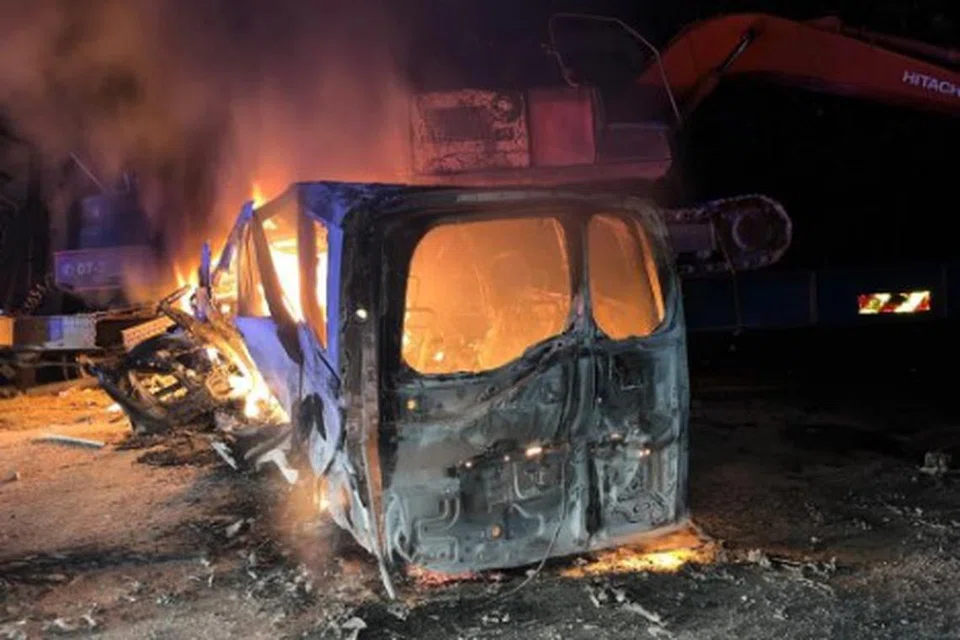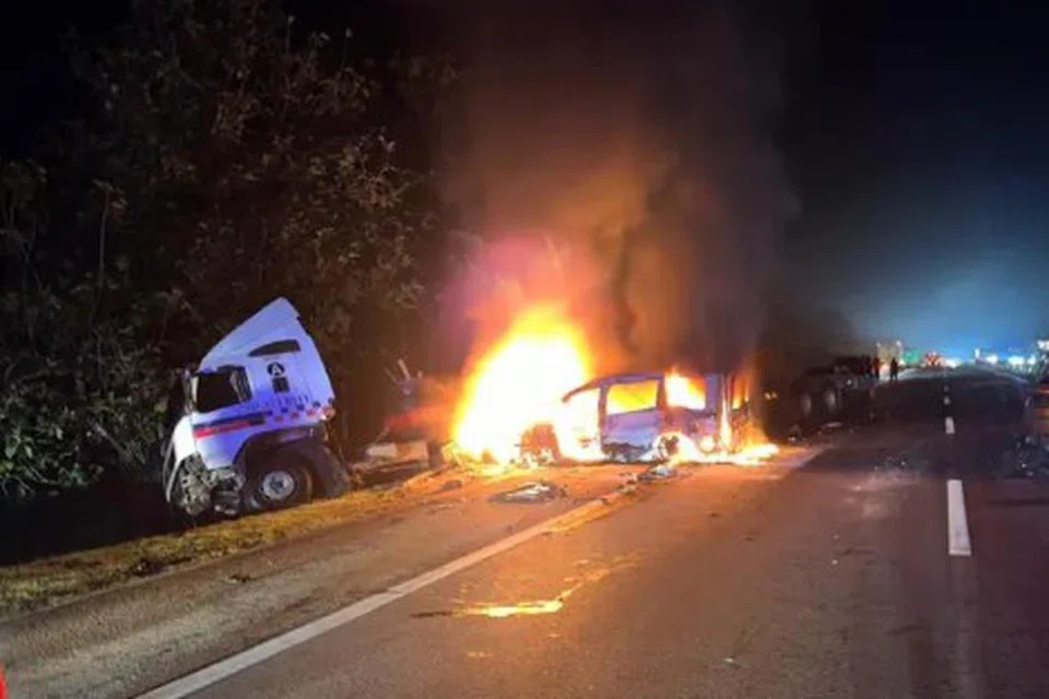 லாரி மோதிய வேகத்தில் ஒரு கார் தீப்பற்றி எரிந்தது. இருப்பினும், காருக்குள் இருந்த அனைவரும் வேகமாக வெளியேற்றப்பட்டனர். அந்த கார் முற்றாக எரிந்து எலும்புக்கூடு போல ஆனது.