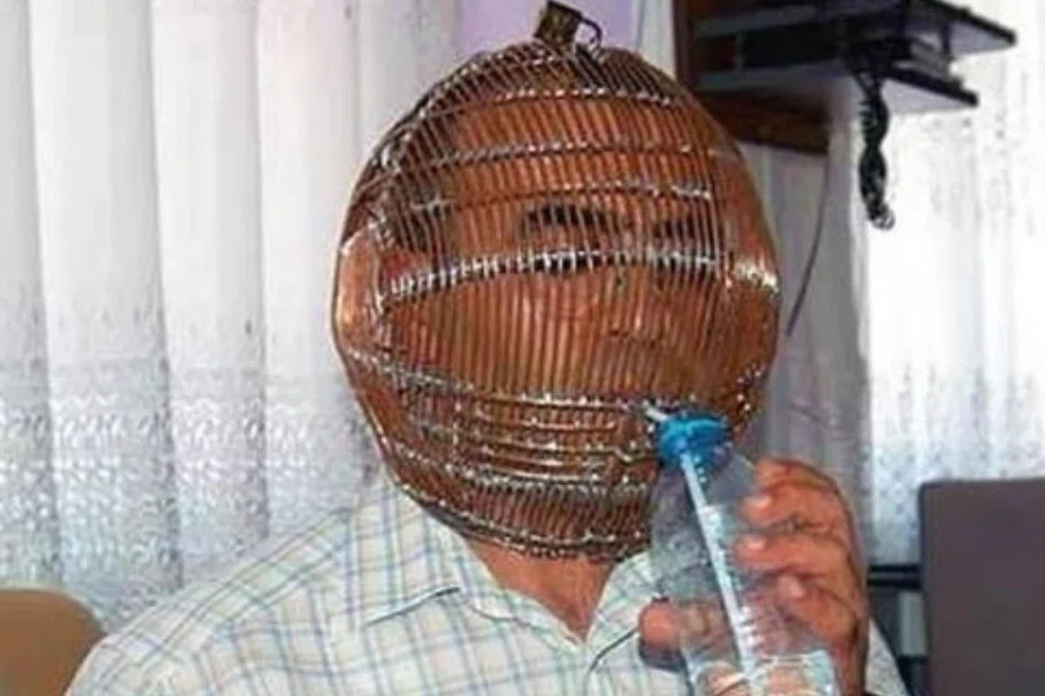 இப்ராஹிம் யூசெல் தலைக்கவசத்தை அணிந்தபடி ‘ஸ்ட்ரா’ மூலம் தண்ணீர் குடிக்கிறார். மற்றொரு படத்தில், அவரது மனைவி, தனது கணவரின் தலையை தலைக்கவசத்துக்குள் வைத்து பூட்டுவதைக் காண முடிகிறது.  - படம்: ஊடகம்