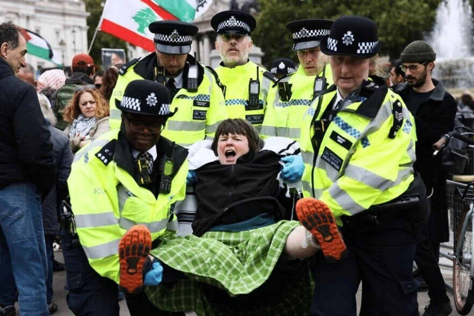 மத்திய லண்டன் வட்டாரத்தில் உள்ள டிராஃபல்கர் சதுக்கத்தில் கூடியிருந்த போராட்டக்காரர்களைக் காவல்துறையினர் கைது செய்தனர்.