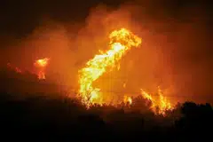 மணிக்கு 70 கிலோமீட்டருக்கும் அதிகமாக வீசும் பலத்த காற்று காட்டுத்தீயை வீடுகள் உள்ள பகுதிகளுக்குப் பரவச் செய்கிறது.