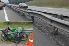 அவர் பயணம் செய்துகொண்டிருந்த மோட்டார் சைக்கிள் சாலைத் தடுப்புமீது மோதியது.