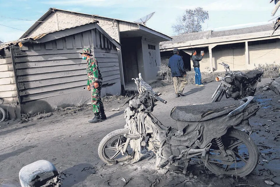 எரிமலை வெடித்து சிதறியதைத் தொடர்ந்து அப்பகுதியில் கரும் புகையும் சாம்பலும் நிறைந்து காணப்படும் நிலையில் இந்தோனீசிய வீரர்களும் கிராம மக்களும் மீட்புப் பணிகளில் ஈடுபட்டுள்ளனர். படம்: ஏஎஃப்பி