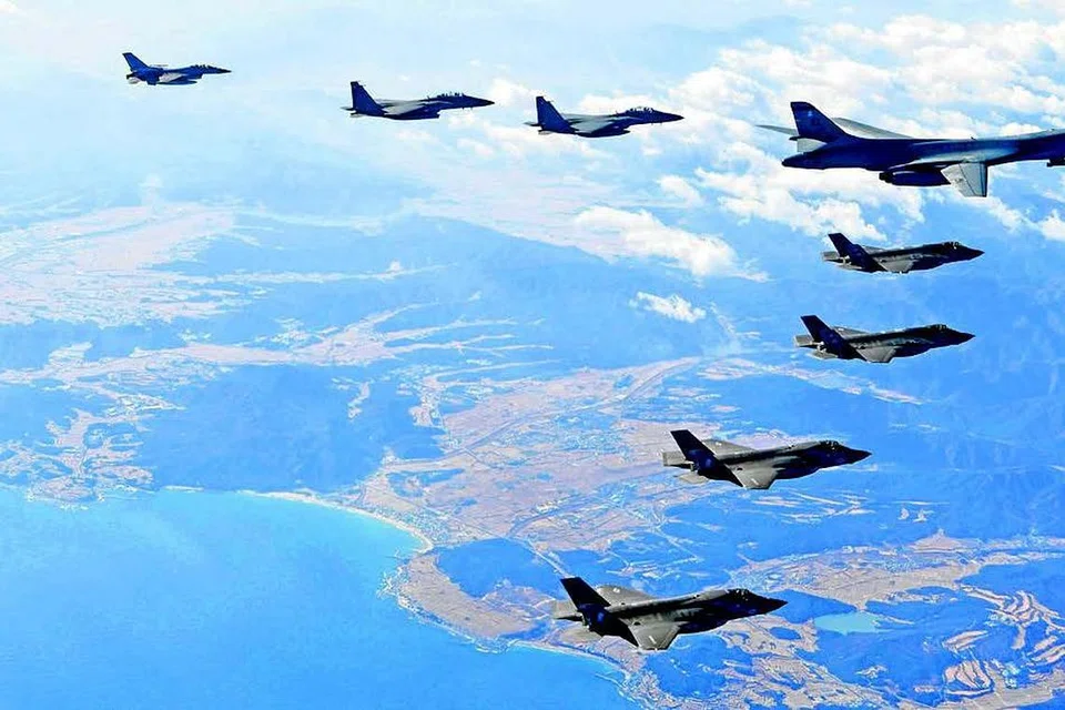 தென்கொரியாவுடனான ராணுவப் பயிற்சியில் அமெரிக்காவின் நவீன 'பி-1பி' லான்சர்(வலம்) குண்டு வீச்சு விமானங்களும் தென்கொரியாவின் 'எஃப்-16' போர் விமானங்களும் ஈடுபட்டுள்ளதை காட்டும் இந்தப் படத்தை நேற்று தென்கொரிய தற்காப்பு அமைச்சு வெளியிட்டது. படம்: தென்கொரிய தற்காப்பு அமைச்சு