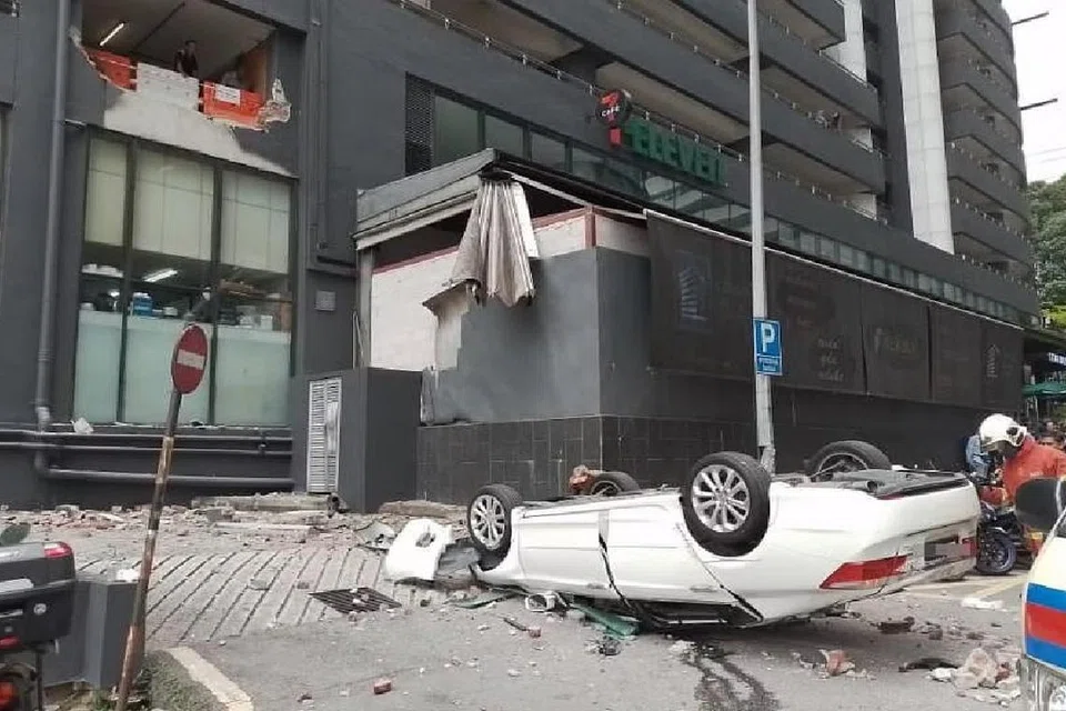 சம்பவ இடத்தை அதிகாரிகள் அடைந்தபோது அடுக்குமாடி வாகன நிறுத்துமிடத்துக்கு அருகில் இருந்த தரைத்தளத்தில் அந்த கார் கவிழ்ந்துகிடந்ததைக் கண்டனர். அதன் மேல் பகுதி சேதமடைந்திருந்தது.
