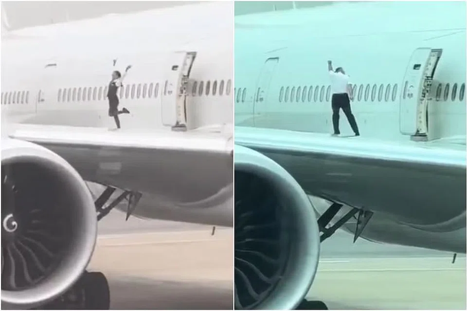 அதில் பெண் சிப்பந்தி ஒருவர் விமான இறக்கையின்மீது நடனமாடுவதும் புகைப்படம் எடுத்துக்கொள்வதும் காணப்படுகிறது.