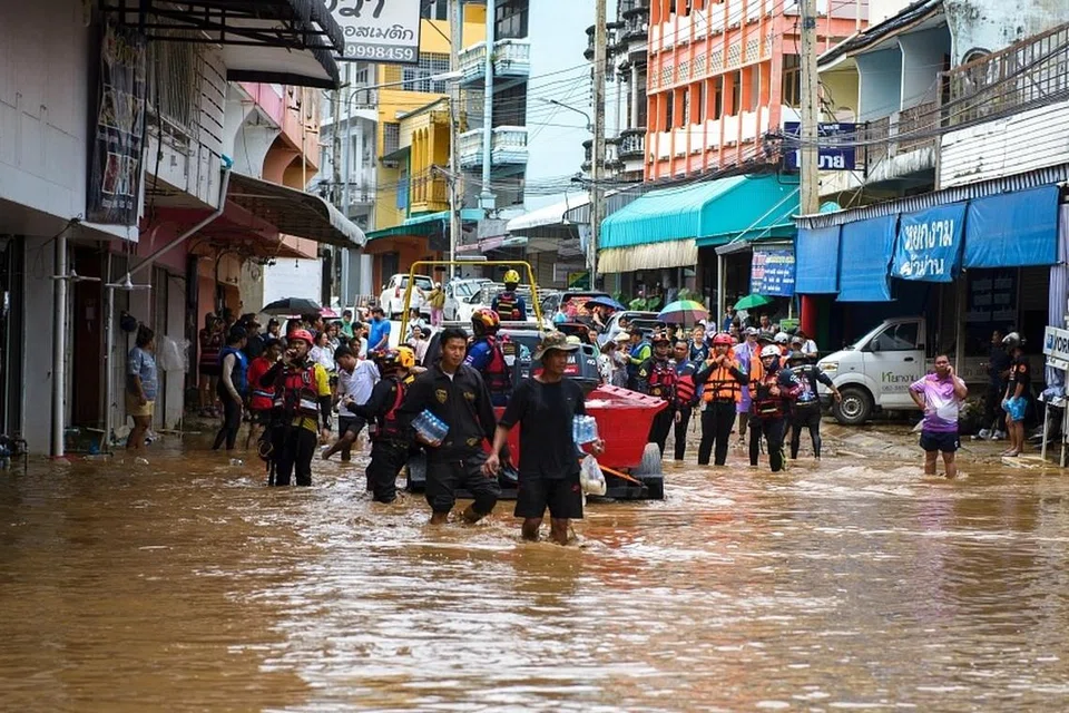தாய்லாந்தின் எல்லை நகரங்களான மே சாய், சியாங் ராய் ஆகிய பகுதிகளைச் சூழ்ந்திருக்கும் வெள்ளத்தில் சிக்கித் தவிக்கும் மக்களுக்கு மீட்புப் பணியாளர்கள் உதவுகின்றனர். - படம்: ராய்ட்டர்ஸ்